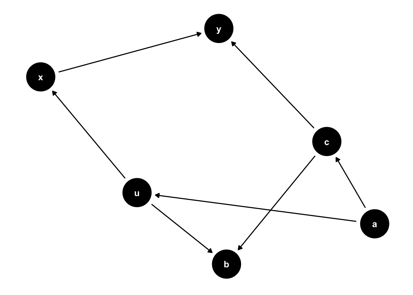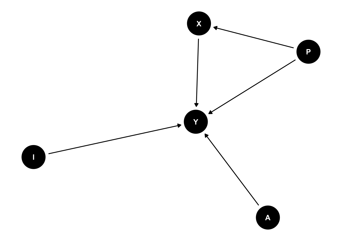 Here, we need to control for P since it is a backdoor from X to Y. Note that there are other variables that also cause Y (I and A) but we don’t need to control for them to estimate the effect of X on Y.