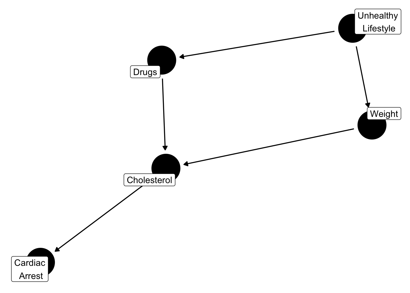 In this example we want to know the effect of drug use on cardiac arrest. Notice there is a backdoor path through unhealthy life styles, to weight, to cholesterol, and onto cardiac arrest. We want to close that backdoor path: we can control for unhealthy lifestyle, OR weight (notice how both break the chain!).