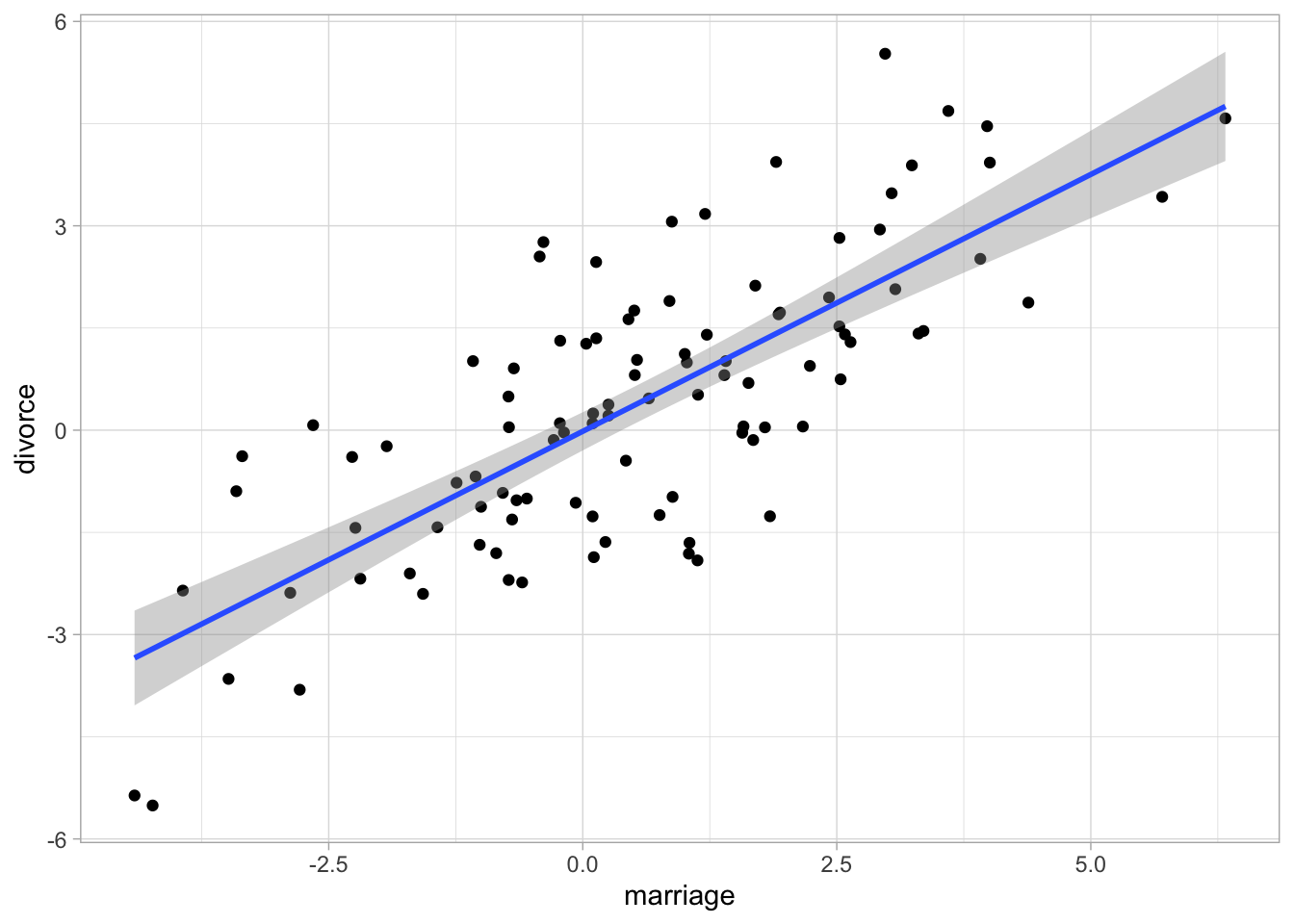 ggplot(fake, aes(x = marriage, y = divorce)) +