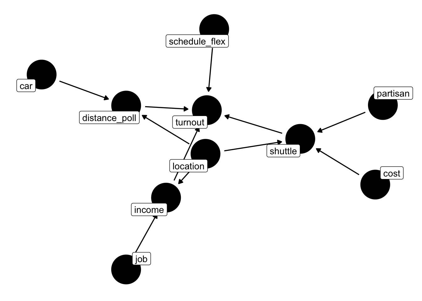 dag = dagify(turnout ~ shuttle + income + distance_poll + schedule_flex,