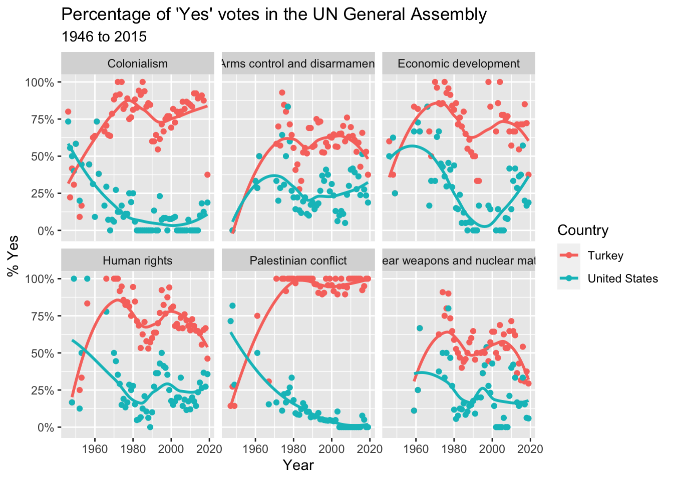 The next chunk of code takes the UN voting data and calculates the percentage of times the US and Turkey voted “yes” on an issue in each year for which there is data.
