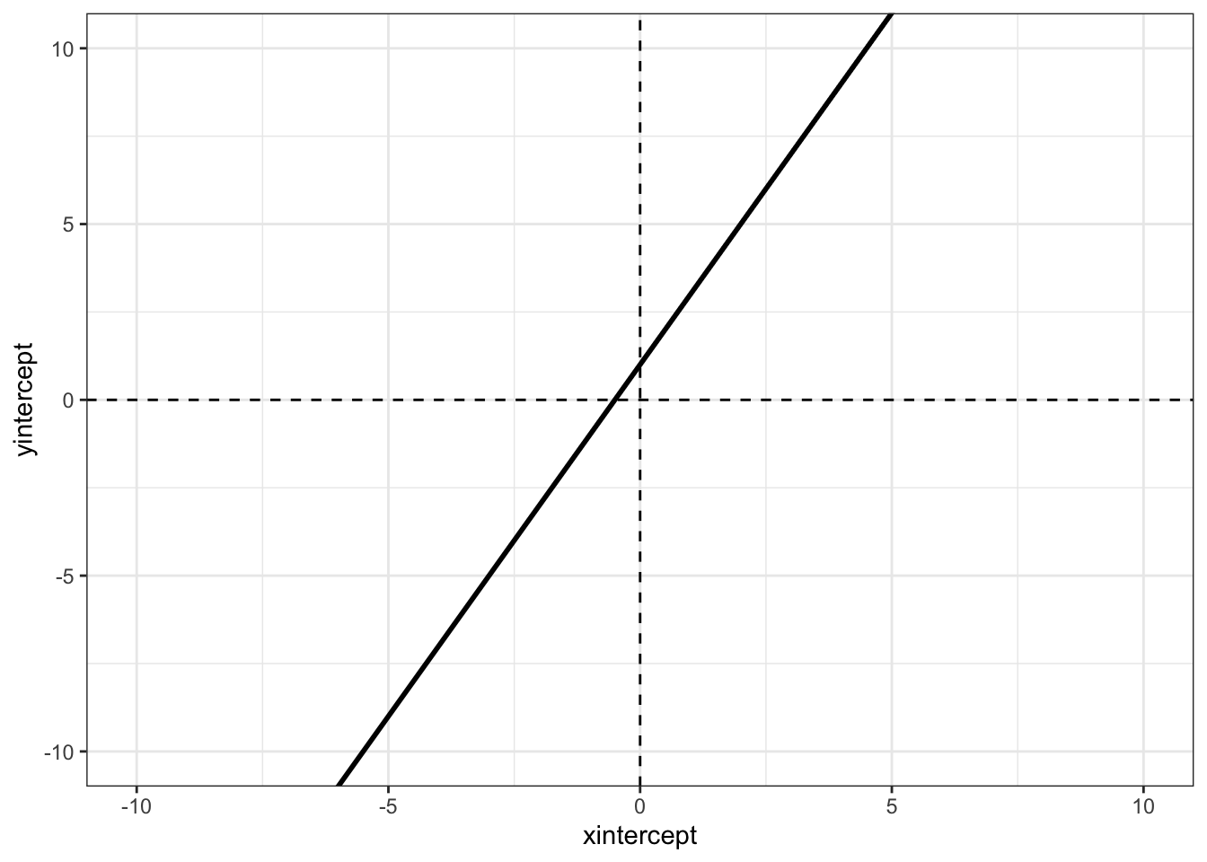 ggplot() + geom_abline(intercept = 1, slope = 2, size = 1) +