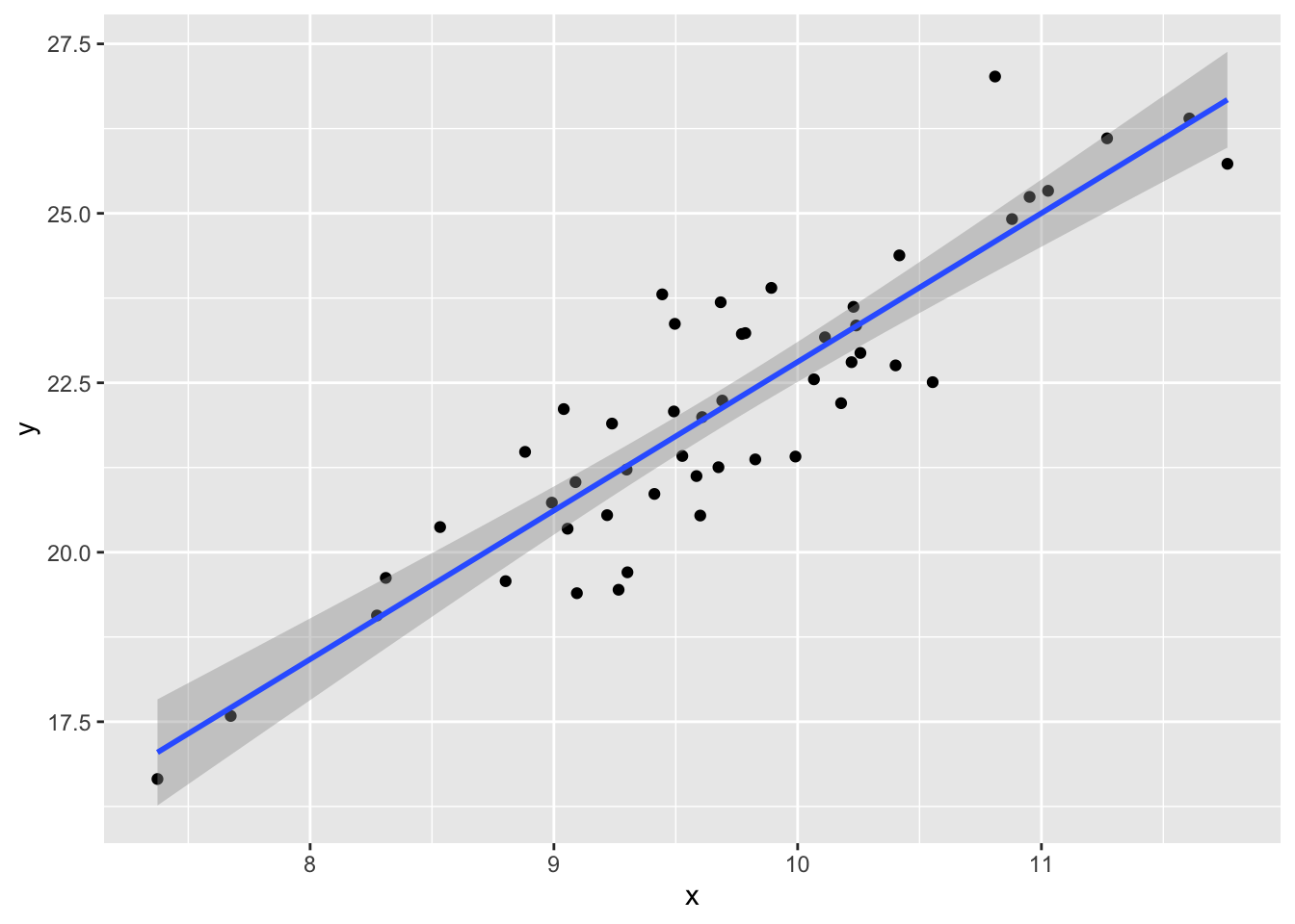 Why draw trend lines? Trend lines give us a good, educated guess as to what the value of a Y variable is given some value of X. We can draw a trend line (or line of best fit) using geom_smooth, as below. Notice method = "lm".