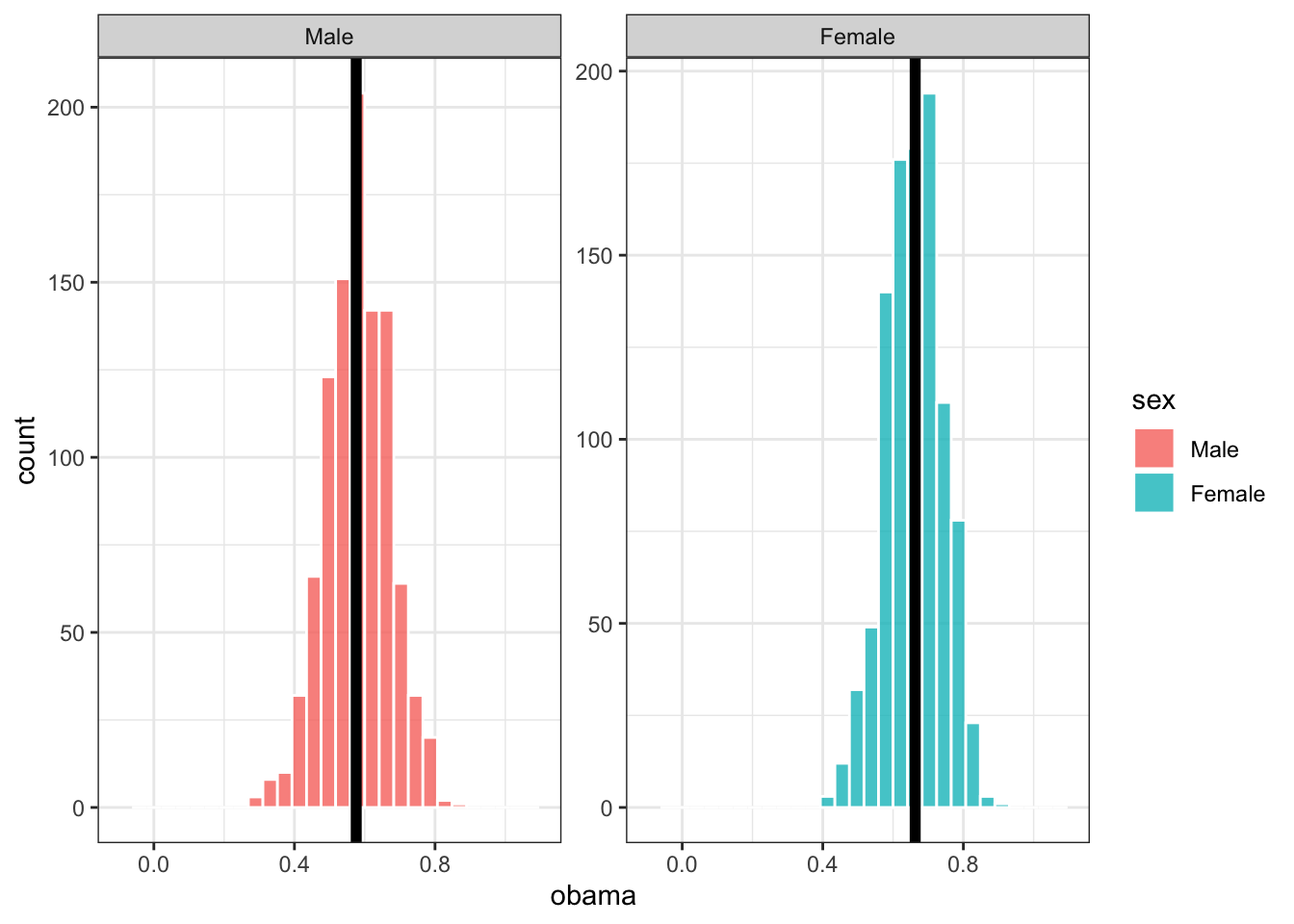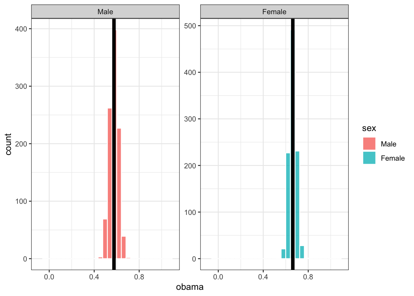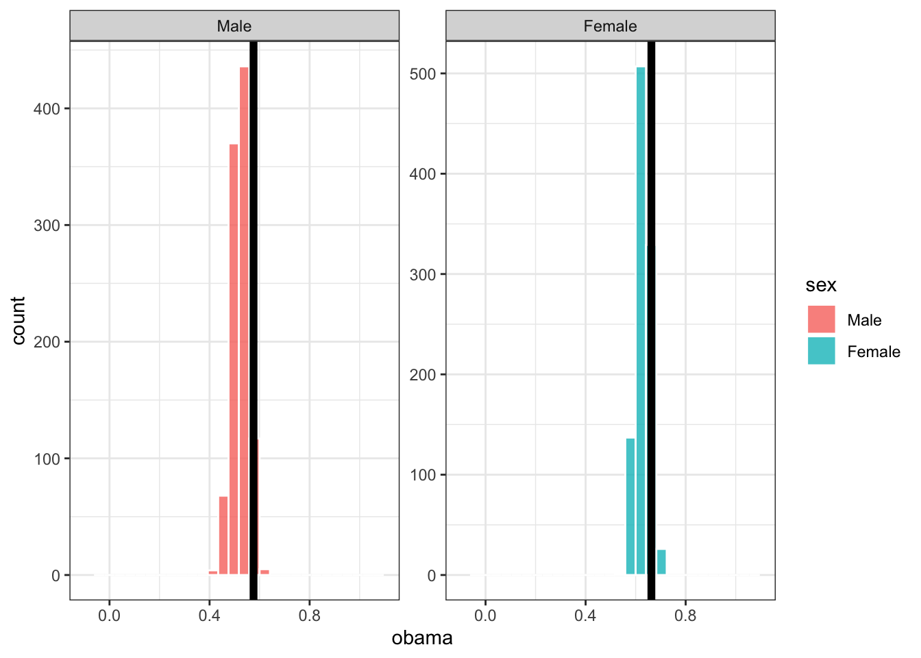 Let’s do this many more times, and plot the distribution of our sample estimates. Below, each sample only has 10 people in it, and we take 1,000 samples. The black bars are the proportion of men and women who voted for Obama across all of gss_sm (the population parameter):