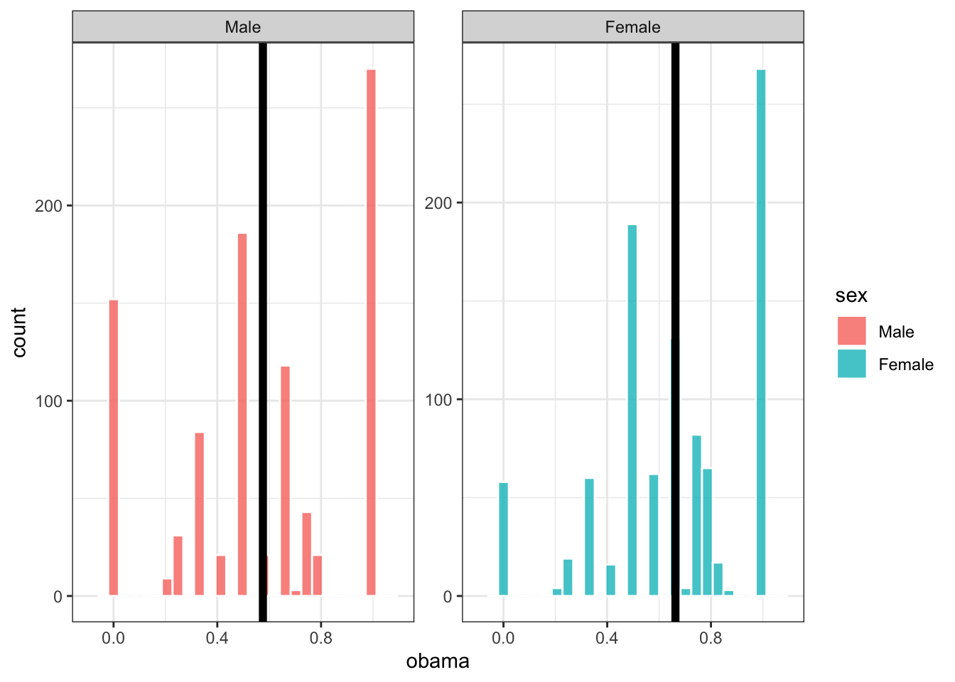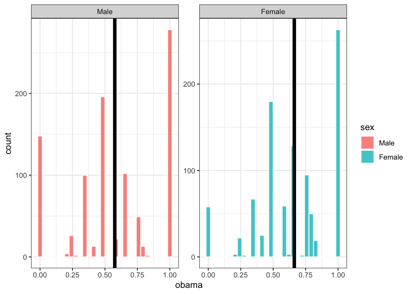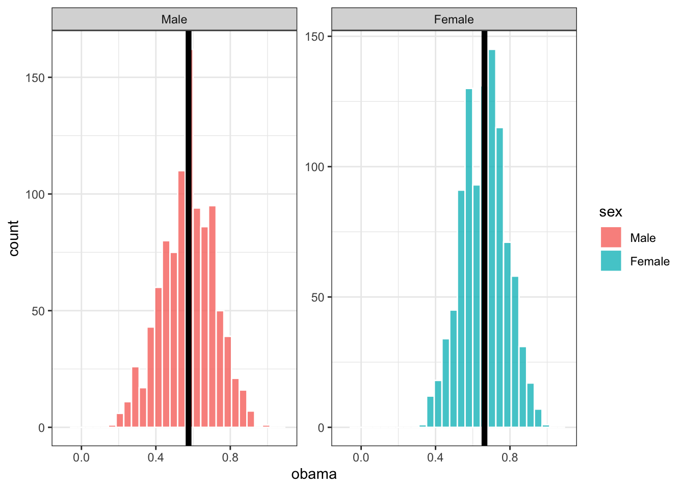 Let’s do this many more times, and plot the distribution of our sample estimates. Below, each sample only has 10 people in it, and we take 1,000 samples. The black bars are the proportion of men and women who voted for Obama across all of gss_sm (the population parameter):