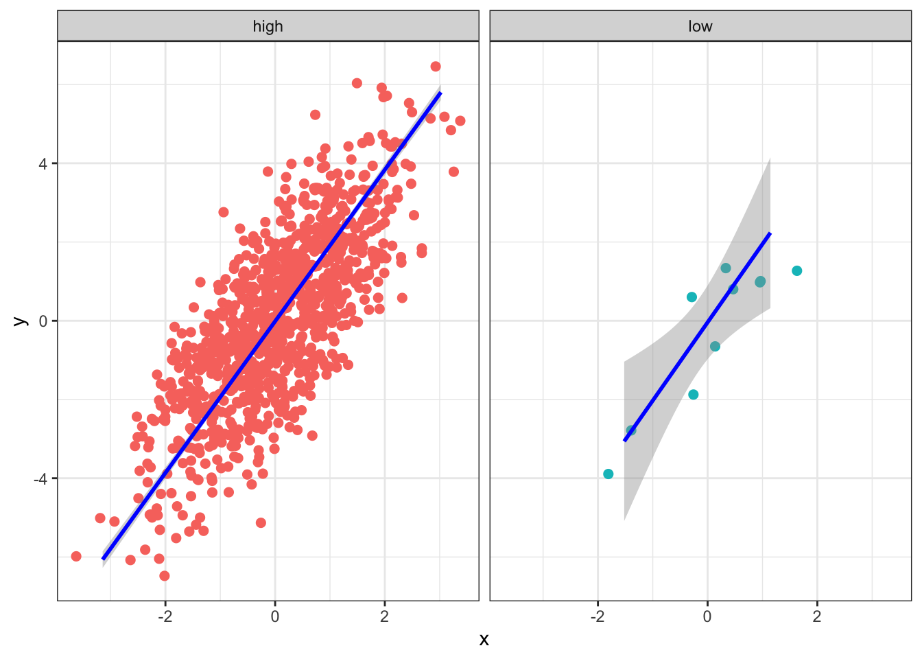 Compare the two trend-lines below: we should be much more certain about the one on the left, even though both have the sample slope (2)!